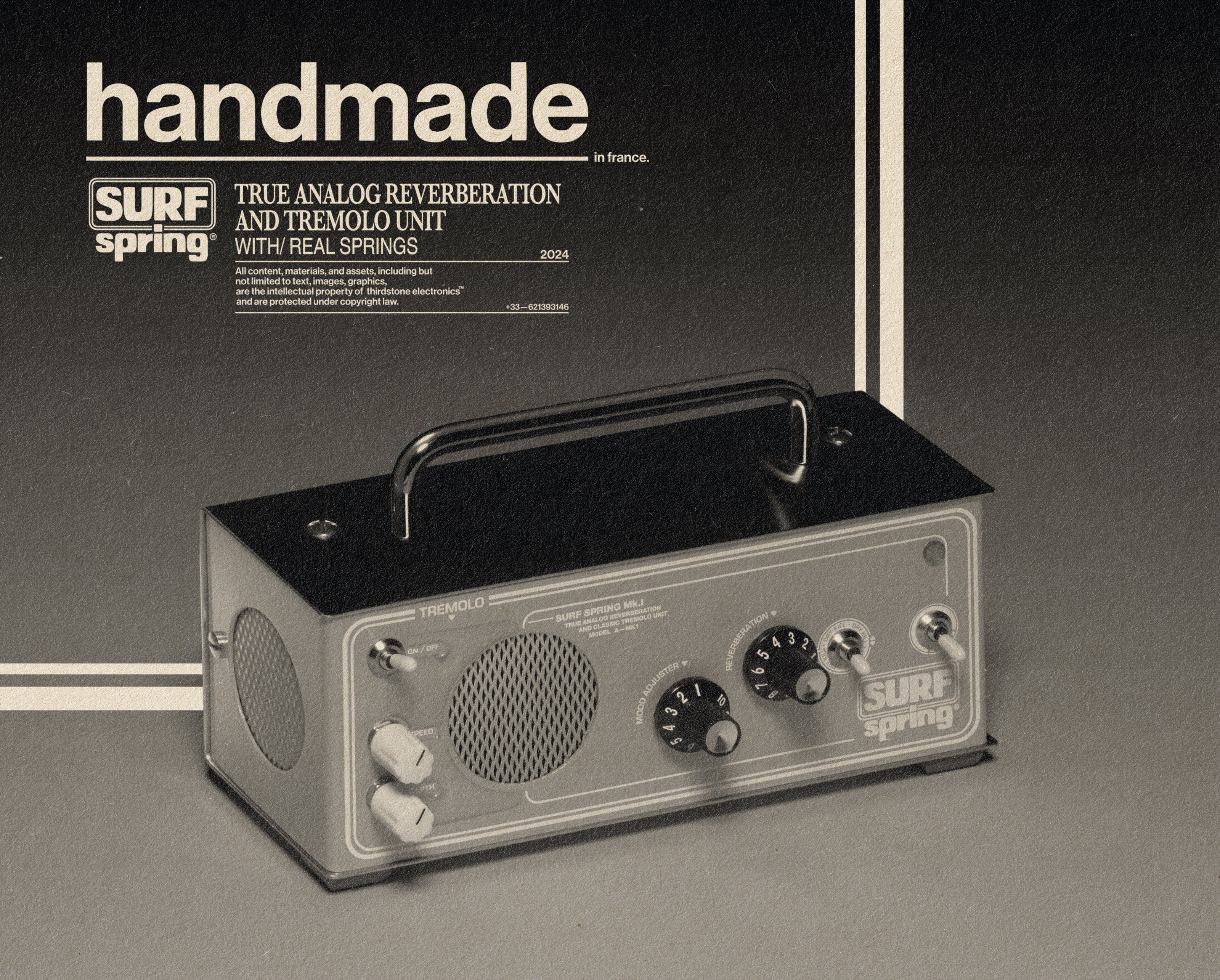 One of the main purpose of the SURF SPRING was to give a second life to this amazing enclosure. We found them in a pretty bad shape tucked away in the rear of an old shop, originally intended as an outdoor alarm box for homes, they were manufactured in France around 1962 and sold by Eugene, who operated a small company named 'Bicalarm' near Paris. The stainless steel is from a formidable quality and their distinctive shape channels the industrial charm of the early sixties effortlessly, we thought it had so much potential for a second chance we took them all (a lot !). However, due to years of poor storage, we had to refurbish them entirely. We managed to salvage a limited quantity of colored ones (in orange and blue; there was even a gold-topped one but none of them made it). Each SURF SPRING underwent meticulous polishing technique to restore its original brushed finish, eradicating blemishes, and layers of old paint. Our graphic design approach was equally deliberate, ensuring the inherent character integrity of the box would stay intact and make it as if it could have been a real product manufactured "industrially" in the early sixties. Welcome to the SURF SPRING — an homage to timeless craftsmanship and inspired design. Follow us on Instagram @thirdstone_electronics to find out more.